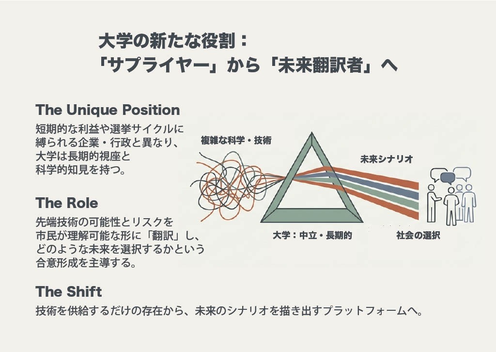 この枠組みでは、経済指標以上に「行動変容」「ウェルビーイングの向上」「制度の変化」といった社会的インパクトを主要な成果指標(KPI)に据え、大学は未来のシナリオを可視化・言語化する「未来の翻訳者(インターメディアリー)」の役割を担うべきであると強調されました。
